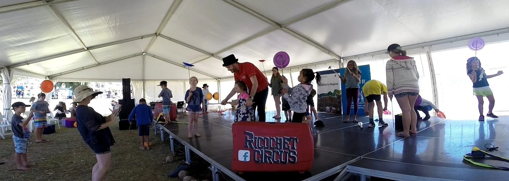 Ricochet Circus has provided exciting circus workshops to hundreds of festivals across Western Australia. In addition, Ricochet Circus has also provided outreach workshops to youth groups, schools, Be-Active projects and Indigenous communities. Mr. Ricochet has always been there promoting creativity and encouraging everyone to